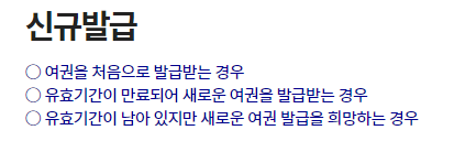 | 신규발급 ○ 여권을 처음으로 발급받는 경우 ○ 유효기간이 만료되어 새로운 여권을 발급받는 경우 ○ 유효기간이 남아 있지만 새로운 여권 발급을 희망하는 경우 |