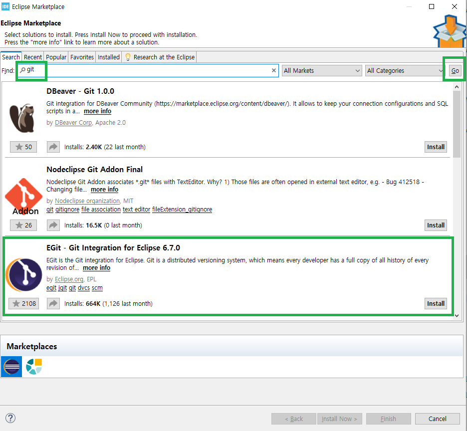 그러면 창이 팝업 되는데, 여기서 Search메뉴의 Find옆 창에 "git"과 enter 키 혹은 옆의 "Go"버튼을 눌러 검색합니다.
