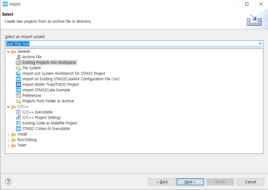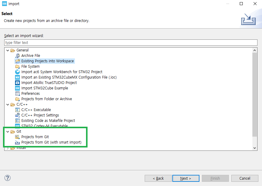 STM32CubeIDE는 이클립스 기반의 IDE로 되어있어, Github연동 방식이 이클립스와 비슷합니다. 중복되는 이름의 프로젝트가 없다는 가정하에 진행합니다. 아시겠지만, Git에 올라가있는 소스가 STM32CubeID