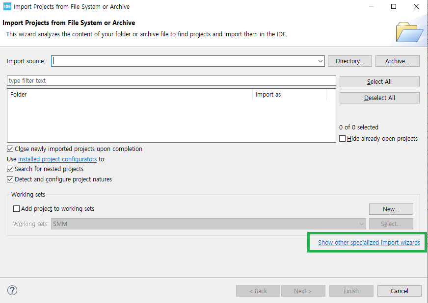 하단 우편의 "Show other specialized import wizards"를 클릭합니다.